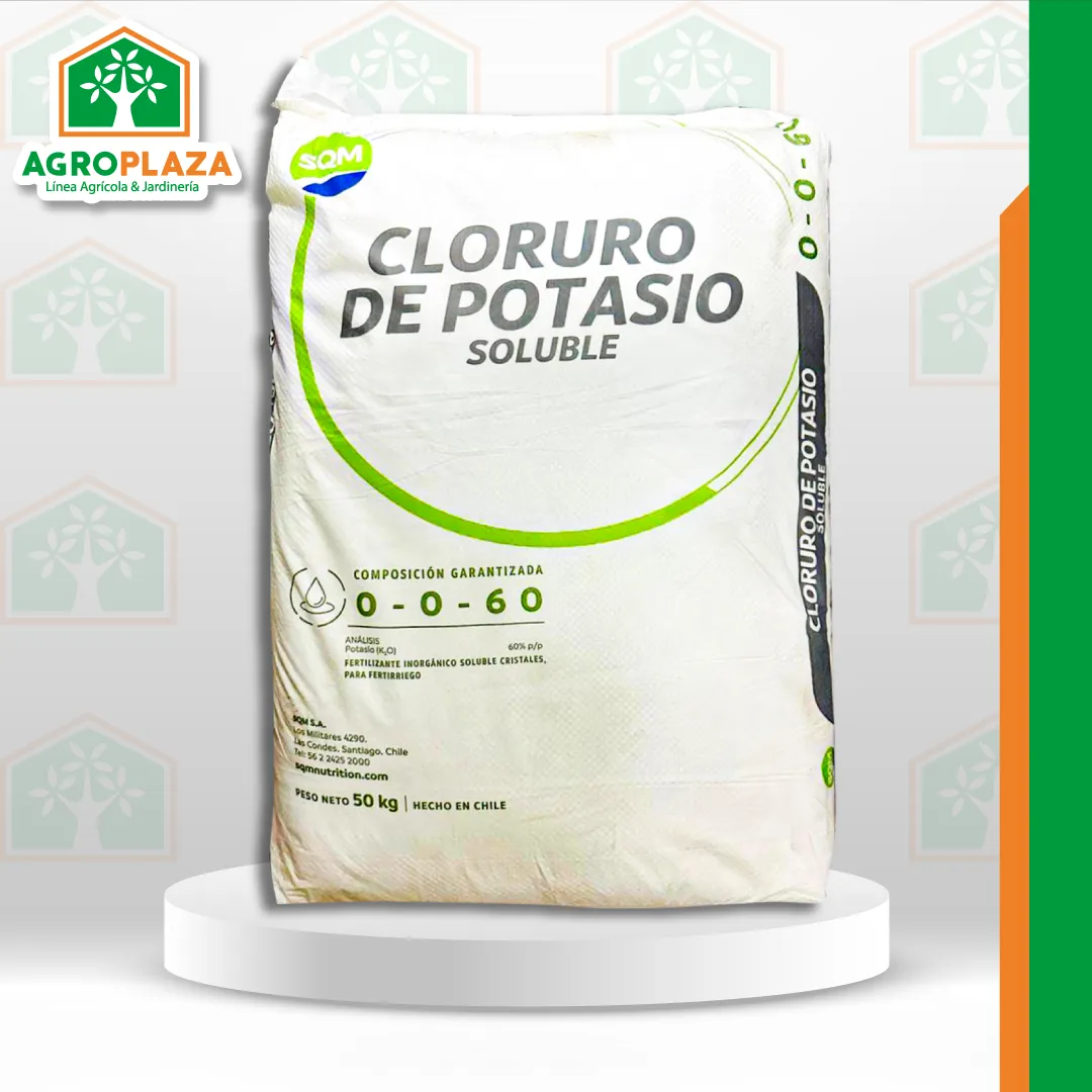 Es un fertilizante con un NPK (0-0-60), cristalizado soluble con la más alta concentración de potasio del mercado (60% K2O). Esta característica lo convierte en una buena fuente de potasio para corregir deficiencias y/o aportar el potasio extraído por los cultivos. Sin embargo, se debe considerar que su alta concentración de cloro no lo hace indicado para ser usado en cultivos sensibles a este elemento.