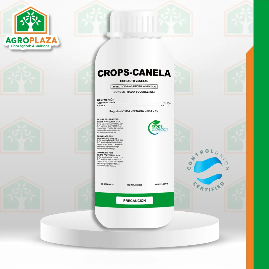 CROPS CANELA es un aceite de canela con acción insecticida y acaricida de contacto. CROPS CANELA es un aceite botánico que contiene sustancias naturales dentro de su composición (como Cinnamaldehido) que causan repelencia y disuasión de la alimentación de los insectos, con posterior muerte de estos; adicionalmente; causa excitación del sistema nervioso provocando enmascaramiento de las feromonas involucradas en el proceso de apareamiento. CROPS CANELA puede ser usado en el manejo de un amplio rango de plagas tales como arañita roja, mosca blanca y ácaros. CROPS CANELA no necesita ser mezclado con coadyuvantes siliconado.
