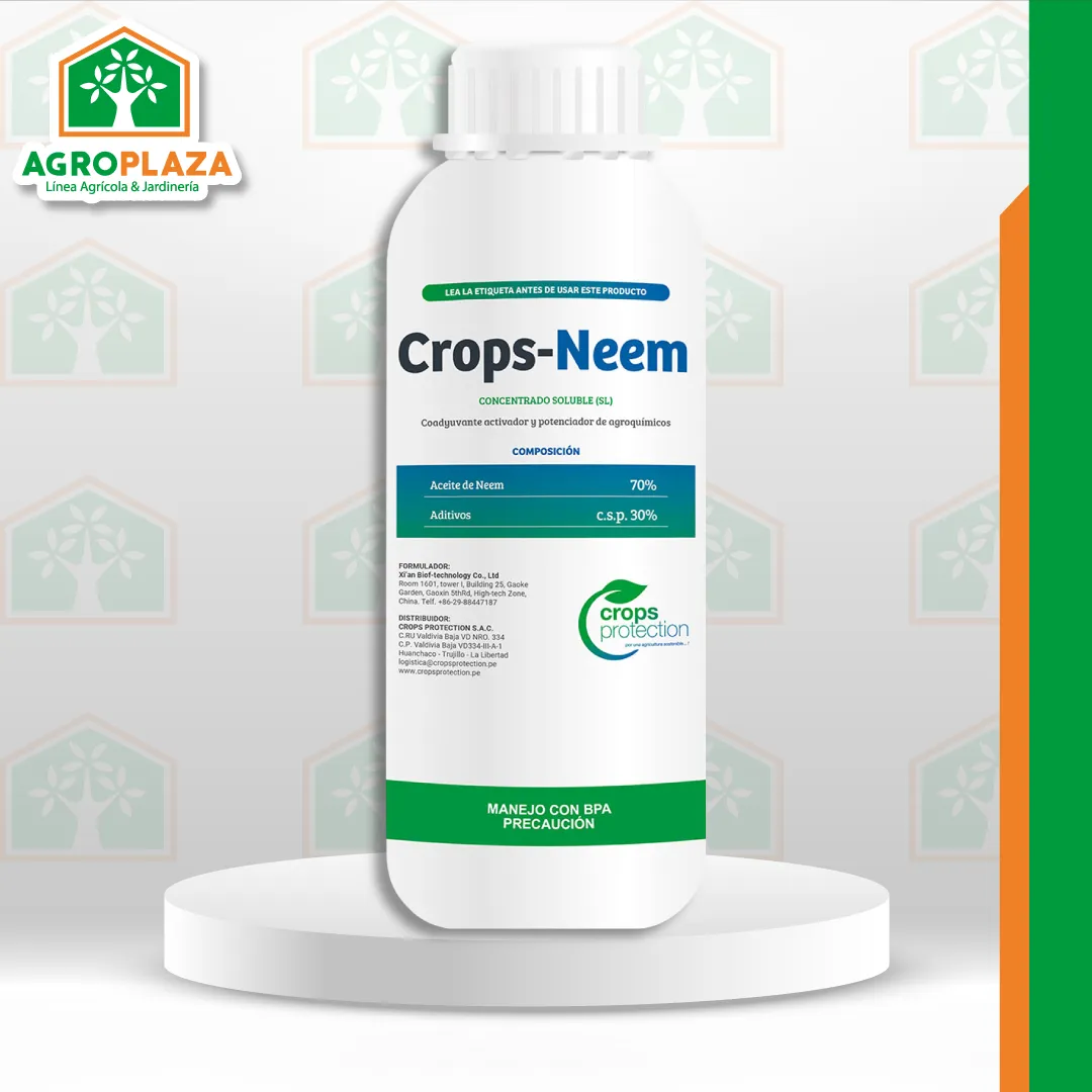 CROPS-NEEM es un coadyuvante a base de aceite de Neem que puede ser asperjado sobre los cultivos como un producto ecológico e inocuo con la fauna benéfica. CROPS-NEEM en mezcla con otros plaguicidas es capaz de romper la resistencia de insectos plaga. CROPS-NEEM tiene efectos sinérgicos cuando se mezcla con pesticidas. CROPS-NEEM refuerza la tolerancia de los cultivos contra el ataque de plagas. CROPS-NEEM es un producto ecológico y amigable con el medio ambiente.