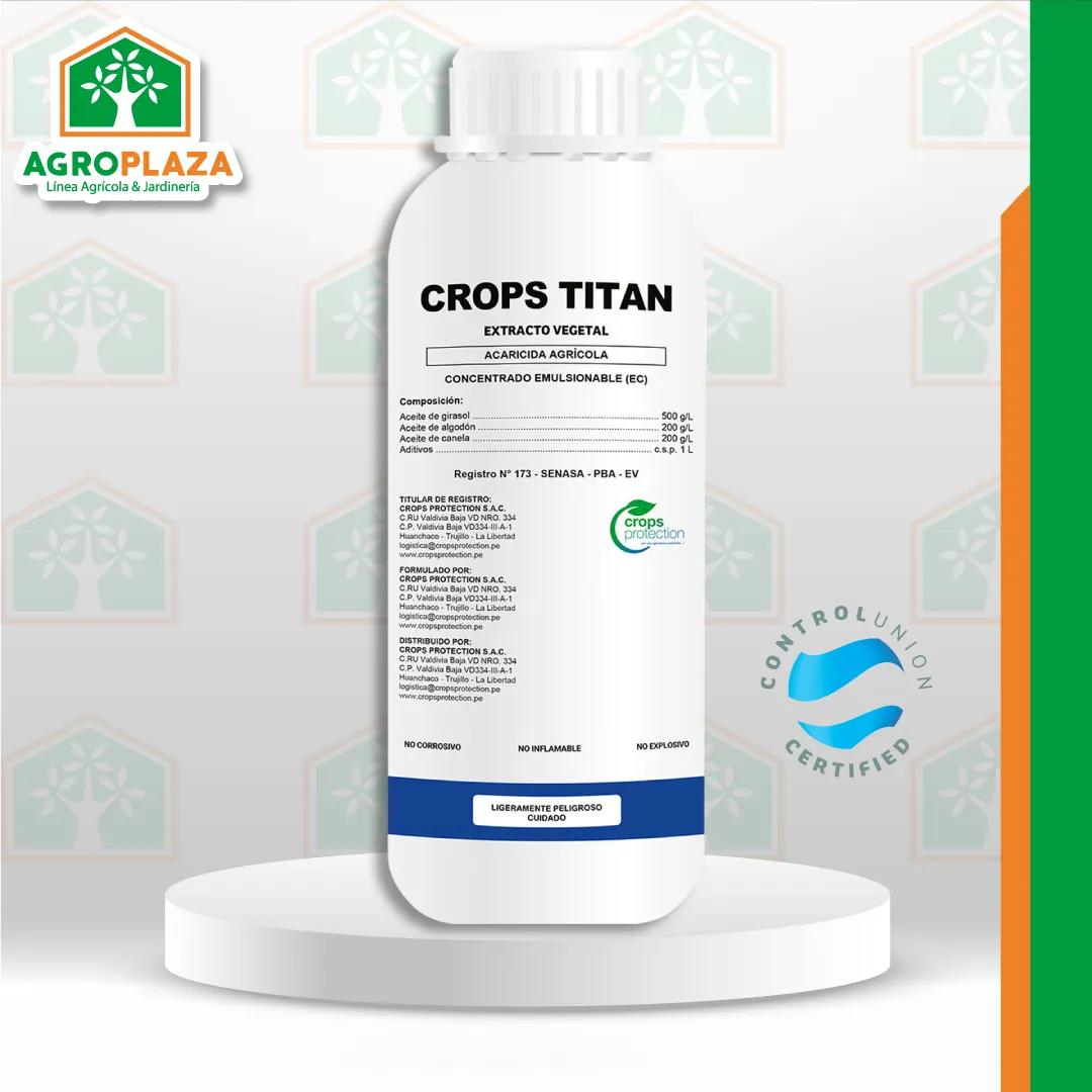 CROPS TITAN es un acaricida biológico que actúa por contacto. Una vez aplicado el producto, ese extracto vegetal actúa a través de la interrupción del intercambio gaseoso, asfixiando o sofocando a la plaga.