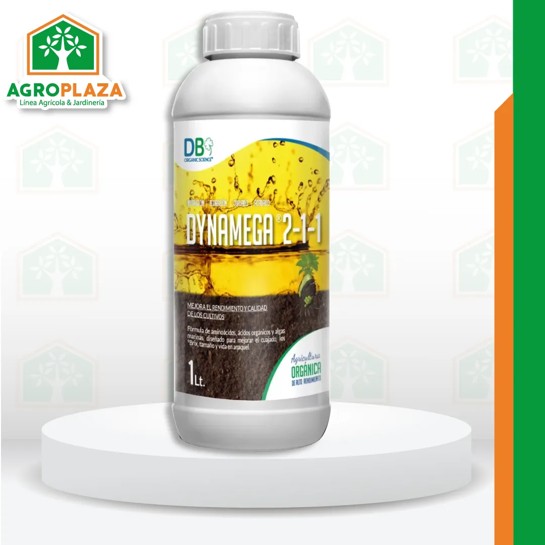 DynaMega® 2-1-1 Producto formulado con un balanceado aporte de aminoácidos poco solubles precursores para la formación de fitohormonas, la presencia de arginina y compuestos bioactivos induce la síntesis de hormonas que participan directamente con la brotación, floración, cuaja del fruto y aumento de tamaño de fruto.