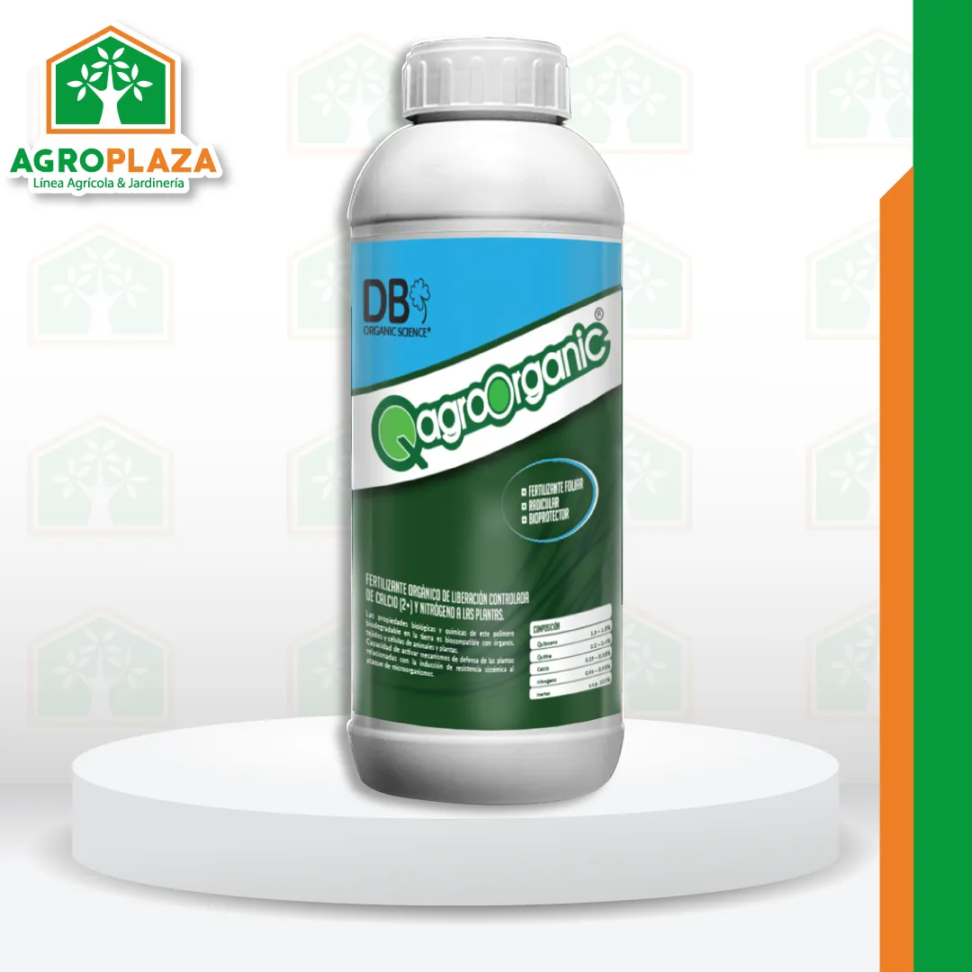 El compuesto activo de este fertilizante corresponde a Nitrógeno orgánico, Quitosano (Poli-β (1→ 4) N-acetil–D-glucosamina), polímero de origen natural, con ión calcio soluble este ultimo cumple la función de regular el pH del suelo, modula la acción de todas las hormonas vegetales regulando la germinación, el crecimiento y senescencia, el quitosano y su complejo con Nitrógeno contribuyen a mejorar la manera de aportar nitrógeno al suelo. El calcio es un macronutriente necesario en las plantas, actúa como modulando la acción de todas las hormonas vegetales regulando la germinación, el crecimiento y la senescencia. Este producto (QAGRO ORGANIC) evita la contaminación de las aguas, aire y suelo, así como también es inocuo para el productor; no provoca la acumulación de sustancias tóxicas en los productos agrícolas alimenticios. La aplicación y uso del quitosano y sus derivados como el QAGRO ORGANIC, se basan en las propiedades biológicas y químicas de estos polímeros, ya que son biodegradables en la tierra y es biocompatible con órganos, tejidos y células de animales y plantas, otros estudios sobre las cualidades del quitosano y derivados (QAGRO ORGANIC), han demostrado su efecto bioestimulador para aumentar los rendimientos de diversos cultivos.