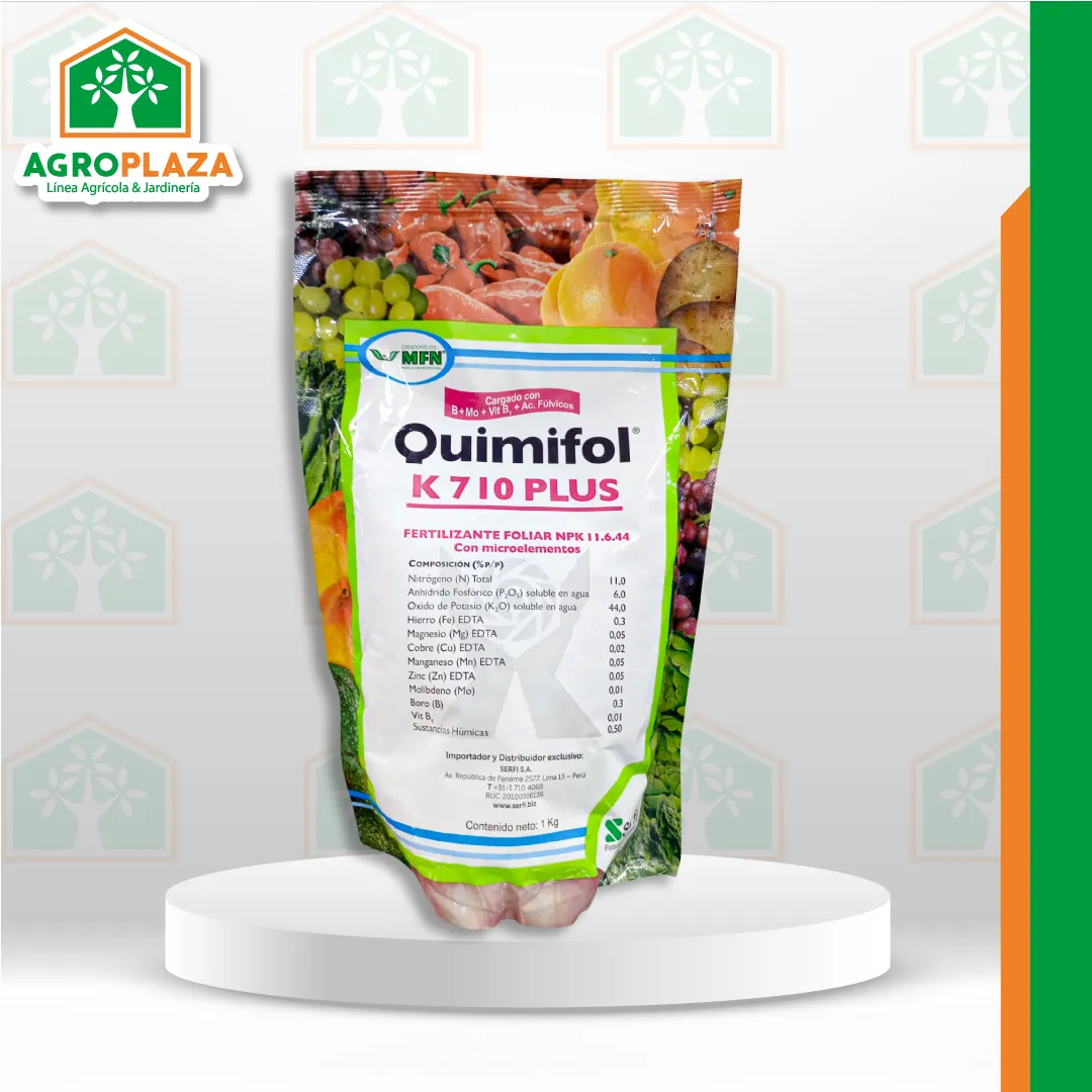Quimifol® K 710 PLUS es un fertilizante foliar totalmente soluble, con un alto contenido de potasio, boro, molibdeno, sustancias húmicas y vitamina B1, cuya función principal es favorecer el movimiento principal de los azúcares, desde las hojas hasta los órganos de almacenamiento (frutos, tubérculos, bulbos, etc).
