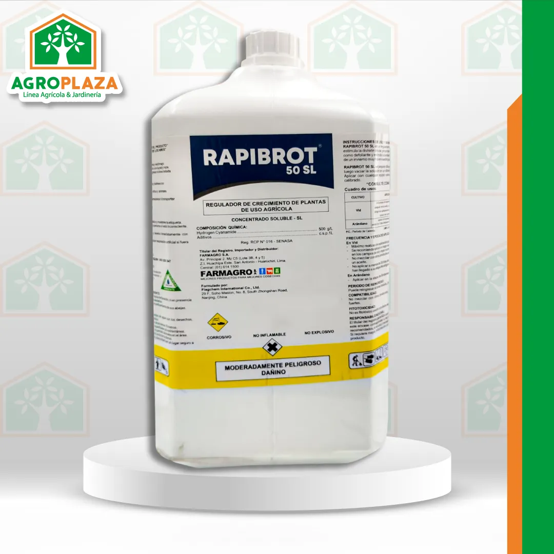 RAPIBROT, es un regulador de crecimiento que estimula el brotamiento al compensar horas de frio. RAPIBROT se aplica en uvas, manzanos y melocotoneros produce una brotación de yemas más abundante, más uniforme y más temprana. RAPIBROT rompe la dormancia de las yemas, elimina la dominancia apical, mejora la calidad, aumenta la producción y productividad de los frutales caducifolios.