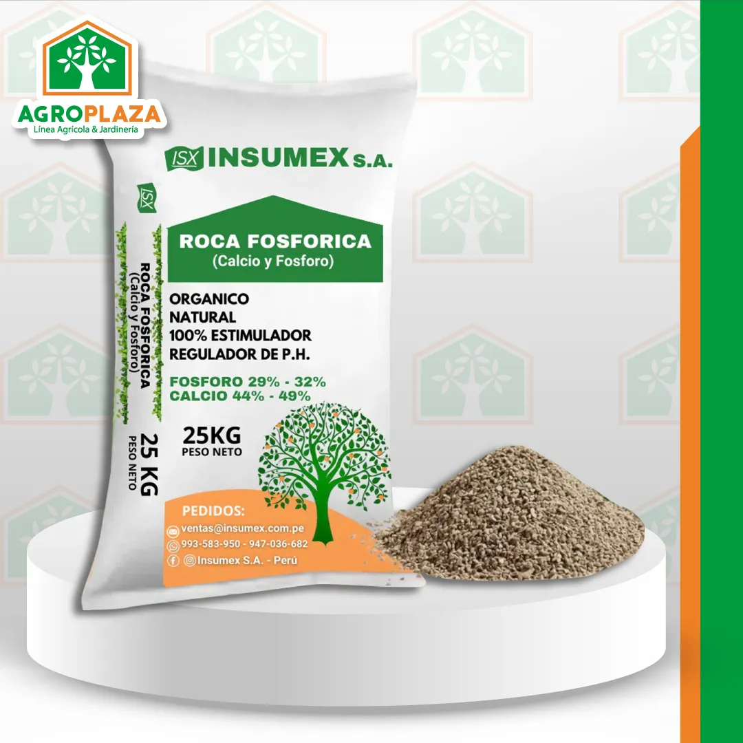 La Roca Fosfórica, es un Fertilizante Ecológico de suelos, que se utiliza en forma directa para todo tipo de cultivos, su principal elemento, el fósforo (P2O5), es indispensable para el enraizamiento, desarrollo, activador de la floración de las plantas, da resistencia contra plagas y enfermedades, posee efecto tampón estabilizador del pH de los suelos.