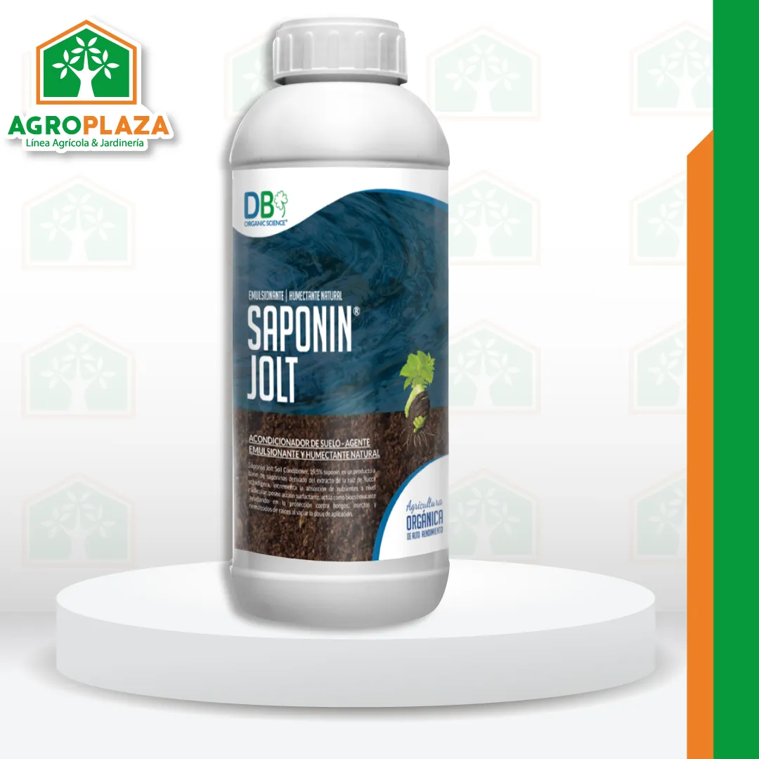 Saponin Jolt Soil Conditioner®, 19.5% saponin, es un producto a base de saponinas derivado del extracto de la raíz de Yucca schidigera, incrementa la absorción de nutrientes a nivel radicular, posee acción surfactante, actúa como bioestimulante ayudando en la protección contra hongos, insectos y nemátodos de raíces al variar la dosis de aplicación.