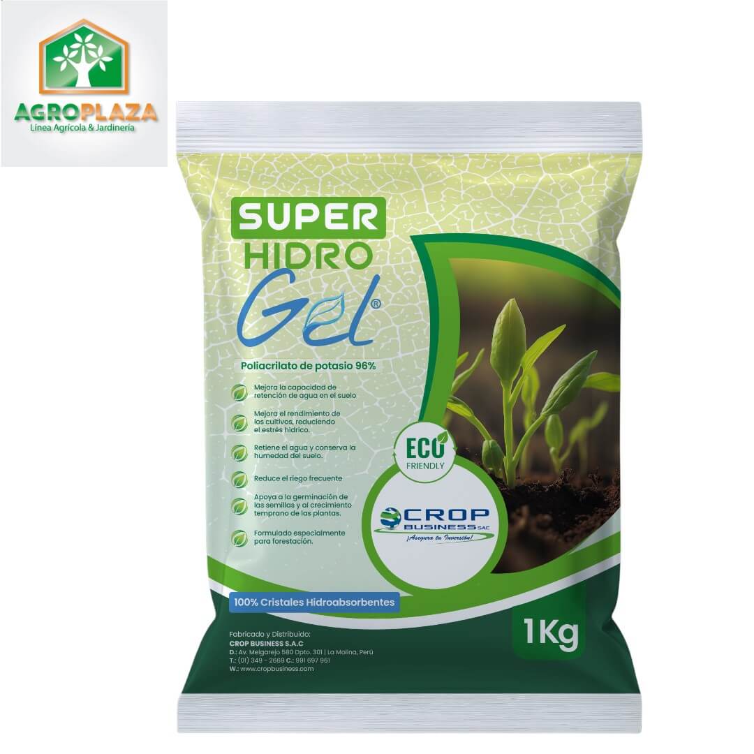 SÚPER HIDROGEL®, es una estructura tridimensional conformada por cristales absorbentes que retienen agua hasta 300 veces su tamaño evitando así el drenaje del agua de riego y mejorando su eficiencia en los cultivos.