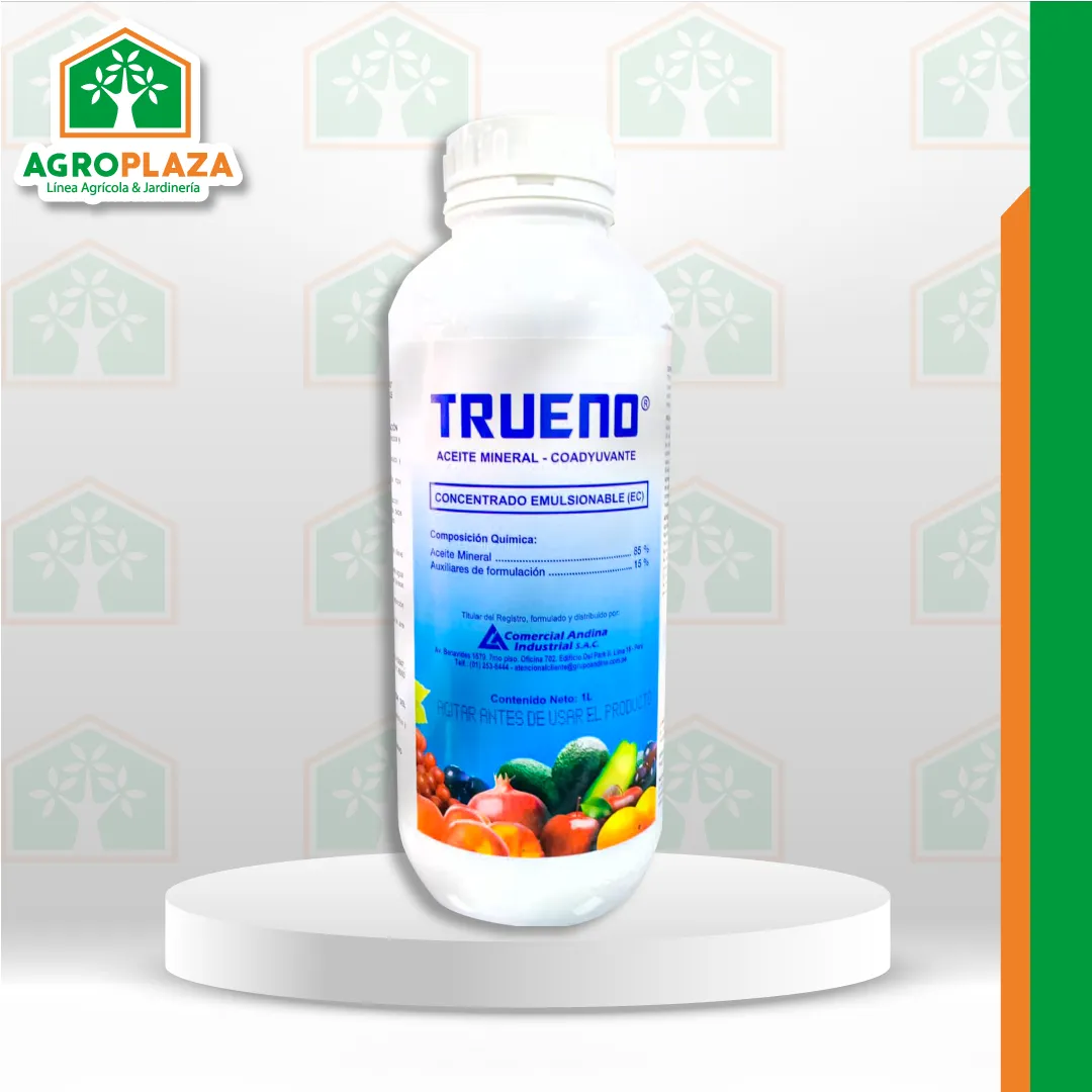 TRUENO es un aceite de origen mineral especialmente formulado para uso agrícola que actúa como coadyuvante mejorando la dispersión y adherencia en mezcla con herbicidas, fungicidas e insecticidas. Es prácticamente inocuo para los enemigos naturales y está recomendado para Programa de Manejo Integrado de Plagas. Es amigable con el ambiente, al ser biodegradable.